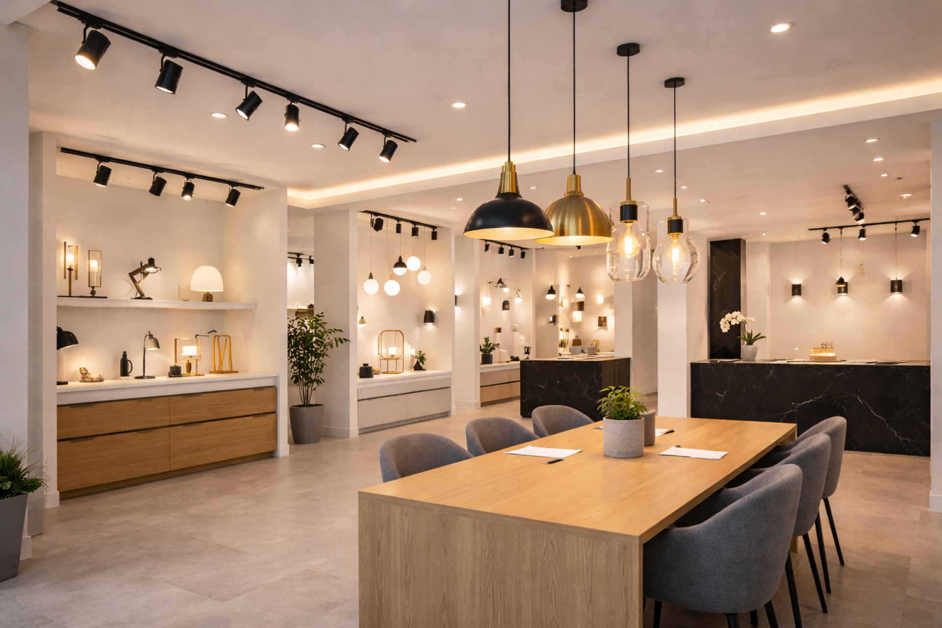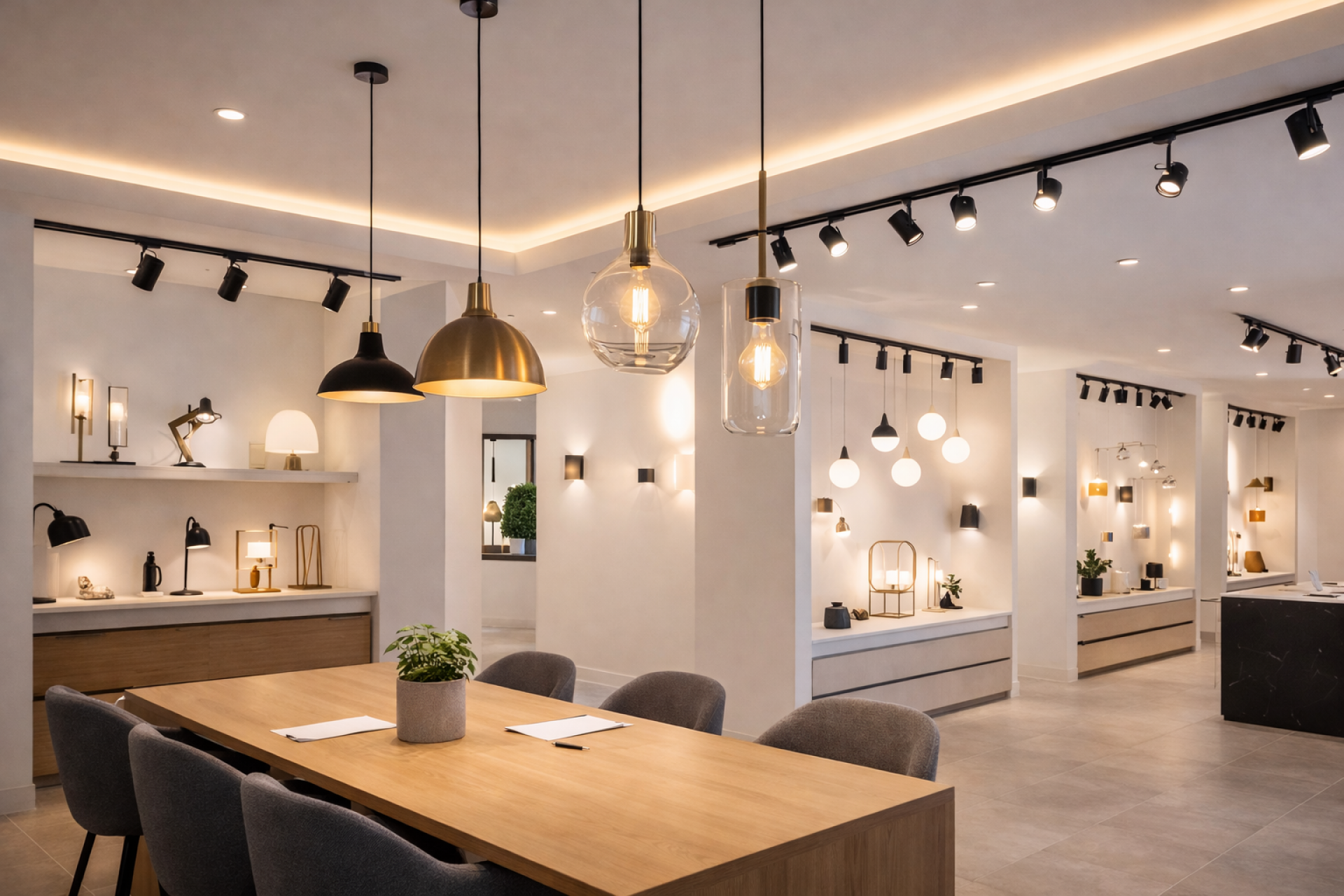 Projeto de iluminação para showroom de iluminação, destacando produtos e criando experiências imersivas.